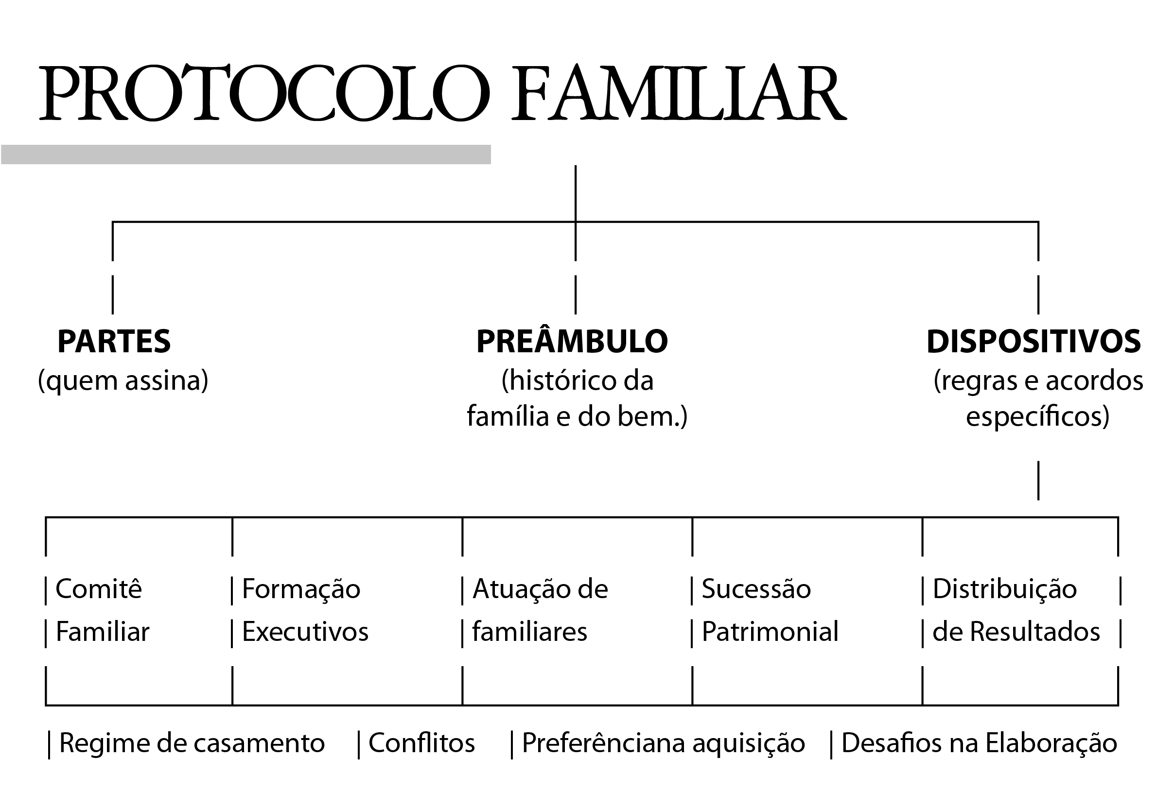 Abaixo, apresentamos um organograma que ilustra a estrutura típica do Protocolo Familiar, com os principais dispositivos que devem ser tratados no documento: